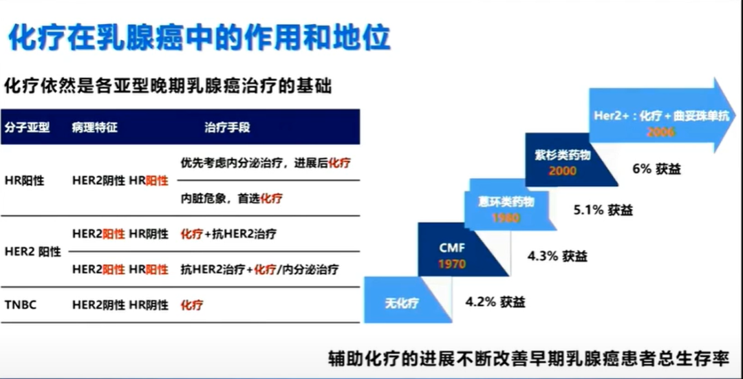 王树森教授在讲课中提到,20世纪40年代氮芥开始应用于淋巴瘤治疗,这揭开了化疗的帷幕。经过80余年的发展,化疗已成为了多种肿瘤治疗的关键组成。近年来,随着靶向治疗发展及免疫治疗的崛起,化疗的地位受到了挑战。但在乳腺癌治疗中,化疗仍是各种亚型晚期乳腺癌治疗的基础。