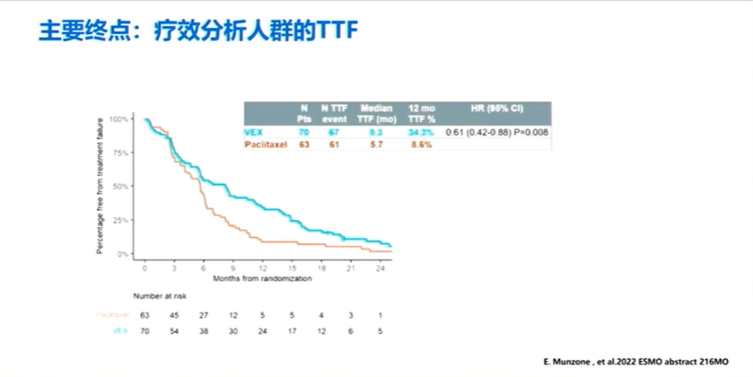 以上两项研究都为单臂试验,METEORA-Ⅱ研究则是节拍化疗与传统化疗头对头对比的双臂试验,该研究对比了VEX方案节拍化疗与紫杉醇周疗治疗ER+/HER2-转移性乳腺癌的疗效。与紫杉醇周疗相比,节拍化疗改善了患者的TTF(HR:0.61;95%CI:0.42~0.88;P=0.008);两组患者中位TTF分别为8.3个月和5.7个月;OS无差异(HR=0.98,95%CI:0.59~1.63);55.6%的患者TTF事件原因为疾病进展,23.3%的患者因为AE;G1/G2脱发在使用紫杉醇的患者中报告比例为33.4%,而在节拍化疗组中仅为2.9%。