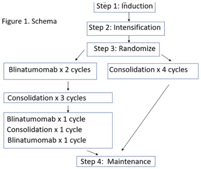 随着2018年3月29日,美国FDA加速批准了贝林妥欧单抗用于治疗后首次或再次CR但MRD阳性(≥0.1%)的成人和儿童B-ALL,本研究中强化治疗后MRD阳性的患者不再随机分组,而是直接分配至贝林妥欧单抗组。该项研究的主要目的是比较贝林妥欧单抗+化疗和单纯化疗治疗MRD阴性患者的总体生存(OS)。