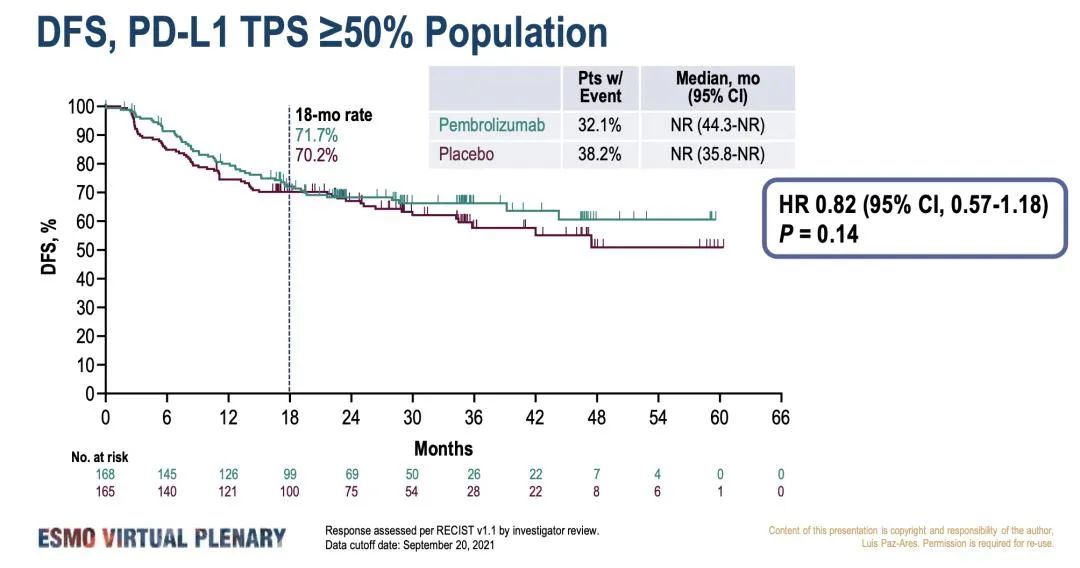 图2 KEYNOTE-091:总人群DFS、PD-L1≥50%患者DFS