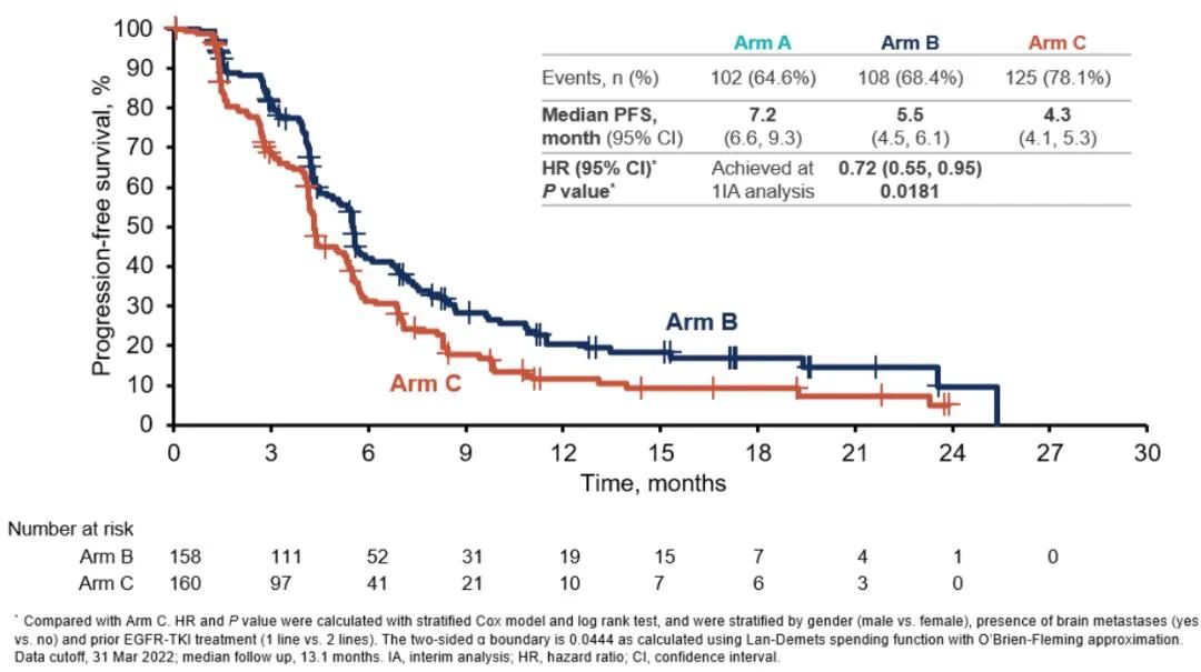 驱动基因阳性一定是免疫治疗的探索“禁区”吗?当然不是。勇者先行,ORIENT-31研究探索了免疫联合方案在EGFR-TKI治疗进展EGFR突变阳性NSCLC患者中的安全性和有效性,该研究的首次中期分析结果于2022年7月正式发表于Lancet Oncology杂志,2022年ESMO大会上,陆舜教授口头报告了ORIENT-31研究的第二次中期分析结果。研究纳入携带局部晚期或转移性NSCLC、EGFR-TKI治疗后进展的EGFR突变阳性NSCLC患者,随机分配(第一阶段为1:1:1,第二阶段为2:2:1)至A组(信迪利单抗+IBI305+化疗)和B组(信迪利单抗+安慰剂+化疗)和C组(安慰剂1+安慰剂2+化疗)。入组患者接受信迪利单抗/安慰剂1(200 mg),IBI305/安慰剂2(15 mg/kg),培美曲塞(500 mg/m2)和顺铂(75 mg/m2),静脉注射,治疗4周期,Q3W。随后,A、B、C组分别接受序贯信迪利单抗+IBI305+化疗、信迪利单抗+安慰剂2+化疗、安慰剂1+安慰剂2+化疗维持治疗。主要终点是按照RECIST v1.1标准评估的无进展生存期(PFS)。2022年3月31日数据截止时,476例患者被随机分配至A组(158例)、B组(158例)和C组(160例),中位年龄为57.0岁,37.0%患者有脑转移。63.0%患者接受了第一代或第二代EGFR-TKI(T790M阴性),26.3%患者接受了第一代或第二代EGFR-TKI后续接受第三代EGFR-TKI(T790M阳性),10.5%患者接受了第三代EGFR-TKI一线治疗。中位随访时间为13.1个月,由独立放射学审查委员会(IRRC)评估的A、B、C组的中位PFS分别为7.2个月、5.5个月和4.3个月。与C组相比,B组的中位PFS显著提高(HR=0.723,95%CI:0.552-0.948;P=0.0181)。由IRRC评估确认的A、B、C组的客观缓解率(ORR)分别为48.1%、34.8%和29.4%。三组的疾病控制率(DCR)分别为86.1%、81.6%和75.6%;三组的中位缓解持续时间(DoR)分别为8.5个月、7.4个月和5.7个月。三组的3级及以上治疗期间出现的不良事件发生率分别为59.5%、46.2%和56.9%。ORIENT-31是首项采用PD-1抑制剂、抗VEGF单抗和含铂双药治疗EGFR-TKI治疗进展后患者的前瞻性、双盲、随机对照的III期临床试验。与单纯化疗相比,四药联合或三药联合均可明显改善EGFR-TKI治疗进展后患者的PFS,且耐受性良好。研究提示对于EGFR-TKI进展的EGFR突变患者,后续要使用免疫治疗,不能忽略再加用“贝伐珠单抗”四药联合可能是EGFR-TKI失败后的一种选择。