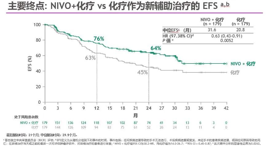 CheckMate-816研究是一项在可切除NSCLC患者中,对比纳武利尤单抗联合化疗vs单纯化疗作为新辅助治疗的随机Ⅲ期研究。2022 AACR会议上,CheckMate-816的另一项主要研究终点无事件生存期(EFS)数据发布,研究结果显示,纳武利尤单抗联合化疗的免疫新辅助治疗组相比单独化疗组病理完全缓解率(pCR率)差异显著(24.0 vs.2.2%,P<0.0001),EFS方面免疫联合组可显著延长患者的EFS(31.6个月vs 20.8个月),降低疾病进展、复发或死亡风险达37%(HR=0.63,P=0.0052)。结果证实,免疫新辅助治疗可显著改善患者的长期预后,并有望最终转化为OS获益:尽管目前生存数据尚不成熟,但已观察到免疫新辅助组相较化疗组的OS早期获益趋势。此外,接受新辅助免疫治疗的患者,后续接受微创手术的比例更高、全肺切除术比例更低,且这部分患者未出现手术治疗延迟,治疗相关不良事件的发生率也并不存在显著差异。新辅助免疫治疗最大的获益群体是达到pCR的患者,与非pCR患者相比,pCR患者的疗效要更好,但也提出了新的挑战,目前为止,达到pCR患者的临床特征和分子特征都不明确。从该研究探索性分析结果可见,30个月时,EFS曲线开始下降,3个周期的新辅助免疫+化疗疗程还不足够,因此需要探索更长周期新辅助免疫联合治疗的结果。