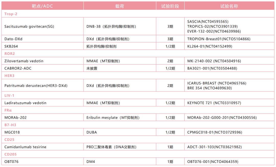 此外,乳腺癌领域还有靶向于ROR2、LIV-1、FRα、B7-H3、CD25、CD205等其他靶点的ADC正在研究中。不同靶点的ADC或许同样可为ER阴性以及ER低表达患者提供精准治疗方案,期待未来能够得到更加丰富的循证医学证据。