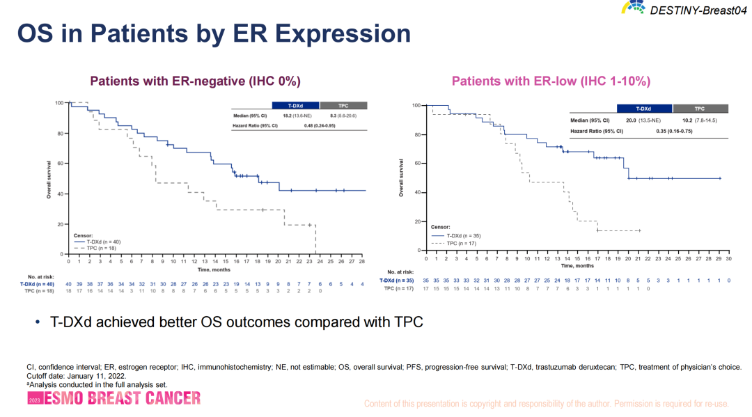 在ER 0%患者中,T-DXd组和TPC组患者的无进展生存期(PFS)分别为8.5个月和2.9个月(HR 0.46,95%CI:0.24~0.89),总生存期分别为18.2个月和8.3个月(HR 0.48,95%CI:0.24~0.95),客观缓解率(ORR)分别为50%和16.7%。