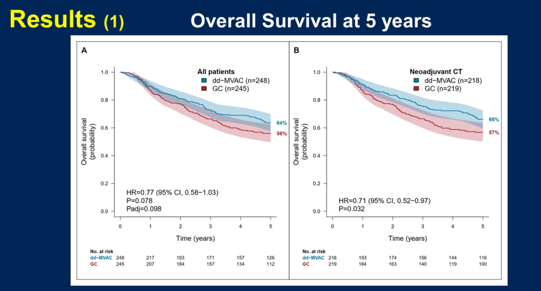 根治性膀胱切除术联合围手术期化疗是MIBC的标准治疗方案,但围手术期化疗的最佳方案仍有待讨论。既往研究中,报道了VESPER研究的主要终点,dd-MVAC较GC方案改善了患者3年PFS。在新辅助治疗组,dd-MVAC组观察到更佳的膀胱局部控制和3年PFS显著差异(P=0.025)。本次大会报告了随机随访5年后VESPERⅢ期试验的OS数据。