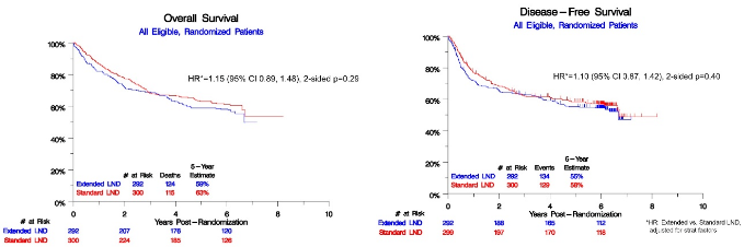 618例符合条件的患者被随机分配至ELND组(n=292)和SLND组(n=300),中位随访时间6.1年。患者中位年龄为69岁,21%为女性,9%非白人。两组患者的临床分期较均衡:T2(71%)和T3-4a(29%)。两组均有57%的患者接受NAC治疗。两组的病理分期为:SLND组和ELND组分别有39%和37%的患者<T2期,>T2期分别为61%和63%。ELND组的中位淋巴结切除率高于SLND组(41 vs 25),但淋巴结转移率无差异,分别为26%和24%。更多的ELND患者患有N2或N3期病灶。与SLND组相比,ELND组与3-4级AEs增加相关:16%vs 8%。26例(4.4%)患者在接受RC后90天内死亡,其中ELND组16例,SLND组9例。两组的DFS无差异(HR 1.10;95%CI 0.87,1.42),单侧LR P=0.82。OS结果相似(HR 1.15;95%CI 0.89,1.48),单侧LR P=0.87。