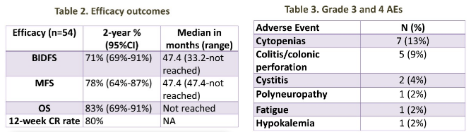 2016年5月至2022年6月,共纳入54例患者,中位年龄74岁,其中46例(88%)患者完成了所有治疗。1/54(2%)、3/54(6%)和4/54(7%)分别停用RT/gem、gem或pembro,最常见的原因是毒性。6例(11%)患者接受了挽救性膀胱切除术。截至2022年6月,中位FU 23个月(1.6-62.7),有12例(22%)患者肿瘤复发(3例MIUC,5例局部复发,4例远处转移)。4例(7%)患者发生非肌层浸润性复发。疗效结果如图所示。本次更新的分析中,未发现新的安全性信号:13例(24%)患者经历了17次≥3级AEs(细胞减少[n=7]、结肠炎[n=5]、膀胱炎[n=2],多发性神经病、疲劳、低钾血症[n=1,每例])。≥3级免疫相关AEs包括2例结肠炎、1例多发性神经病和1例5级结肠穿孔患者。研究表明,TMT联合pembro具有良好的耐受性,且早期数据有望为阳性结果。该联合方案的一项大型的Ⅲ期试验正在进行中,以进一步探索联合治疗的疗效。