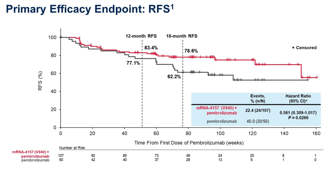 在已切除的高危黑色素瘤患者中,与帕博利珠单抗单药治疗相比,mRNA-4157联合帕博利珠单抗辅助治疗显著延长了患者的DMFS。这些结果进一步证明,个体化新抗原对癌症患者有潜在获益。随后将继续进行针对黑色素瘤患者的Ⅲ期随机研究。