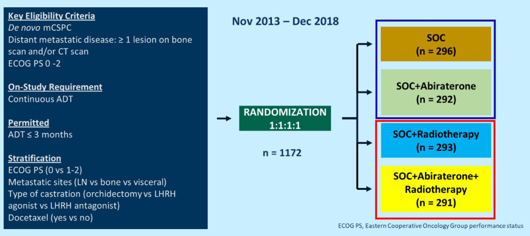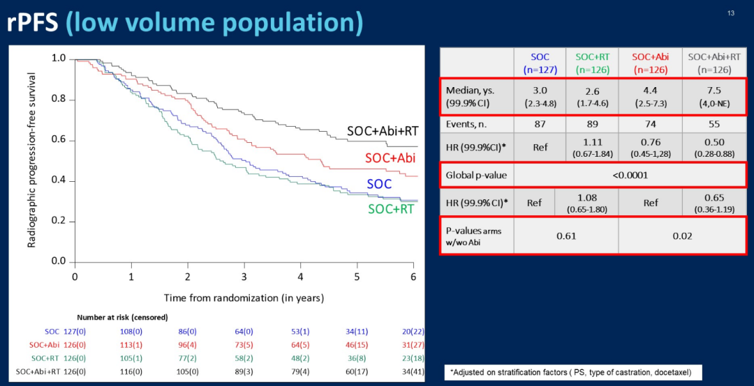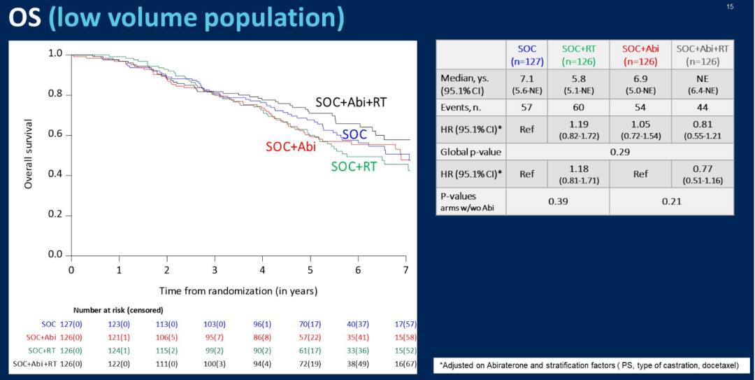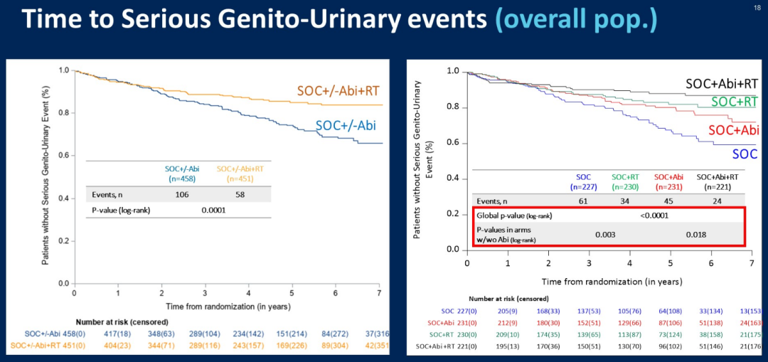 朱耀教授:PEACE-1确实是一项非常有趣的研究,既往已经报道了SOC联合NHT的结果显示有PFS和OS显著获益(包括低瘤和高瘤负荷患者),这次ASCO大会进一步报道了SOC联合局部放疗的结果。首先我们可以看到总体人群中,SOC+Abi+RT组患者的至去势抵抗时间延长到了将近7年,这是一个非常好的数据;再者SOC+Abi+RT组患者的严重生殖-泌尿肿瘤事件数也有显著减少,这对减少局部不适症状来说也是非常好的结果。