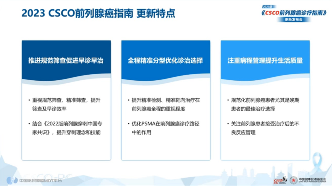 朱耀教授:今天,CSCO前列腺癌诊疗指南已经正式发布。我们的指南是遵循科学的指南制定规则,经过多轮修改讨论所形成的。新版指南的目标是:(1)推进规范筛查,促进早诊早治;(2)全程精准分型,优化诊治选择;(3)注重病程管理,提升生活质量。这三层含义犹如“桥梁”一样环环相扣、紧密联系。例如,新版指南优化了PSMA在前列腺癌诊疗路径中的作用(包括术前分期/术后BCR患者诊断,PSMA核素治疗,疗效预测)。PSMA功能显像以及一些基因检测工具,与我们常规的Gleason评分、CT和MRI、骨扫描等检查方法相比,实现了很大的跨越,临床上应该如何发挥不同方法各自的优势,新版指南有很好的指示,有助于优化我们的诊疗决策。
