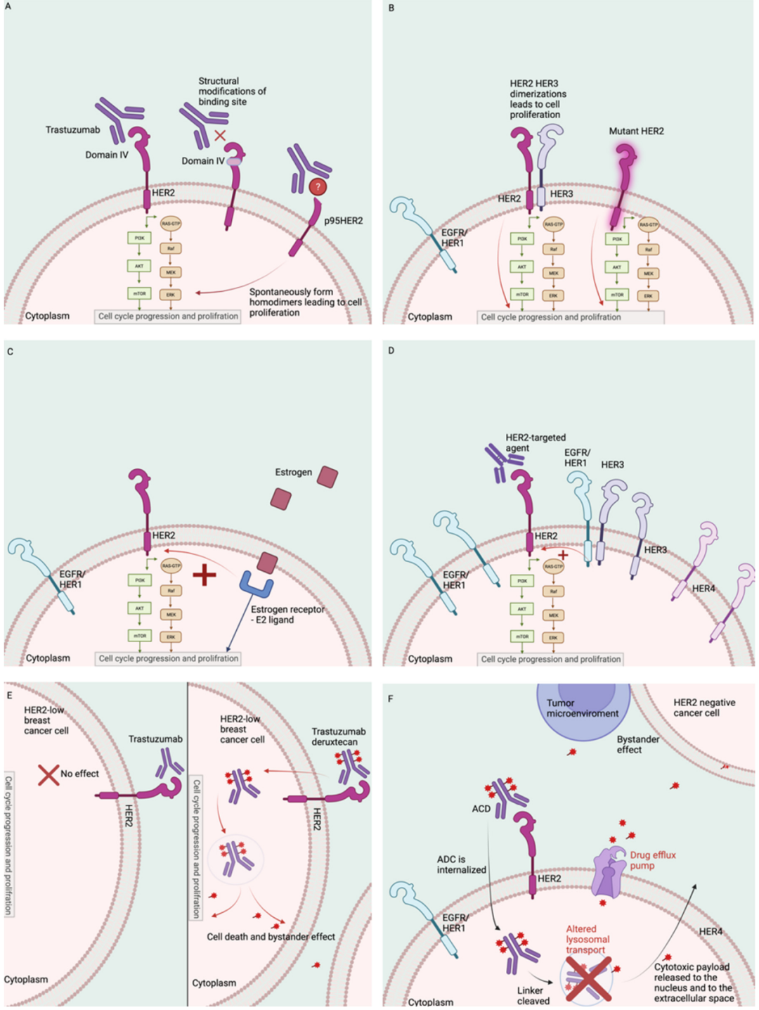 既往研究认为,大分子单抗(mAb)、小分子酪氨酸激酶抑制剂(TKI)的抗HER2耐药机制主要有:HER2结合障碍、HER2突变(如20号外显子L755S、G776C突变)、HER2与雌激素受体(ER)的交互串扰、HER2与其他受体信号转导增加(如EGFR/HER3)、下游信号通路激活(如PI3K/AKT/mTOR、JAK/STAT3)、无法触发ADCC效应、HER2异质性表达等;此外,上一代ADC药物T-DM1的疗效受到HER2抗原表达水平、溶酶体转运变化、载药化疗外排泵的影响[1]。总体上,这些耐药机制可以分为两大类,即HER2本身“数量和质量”方面的异常以及其他分子信号通路的异常激活。