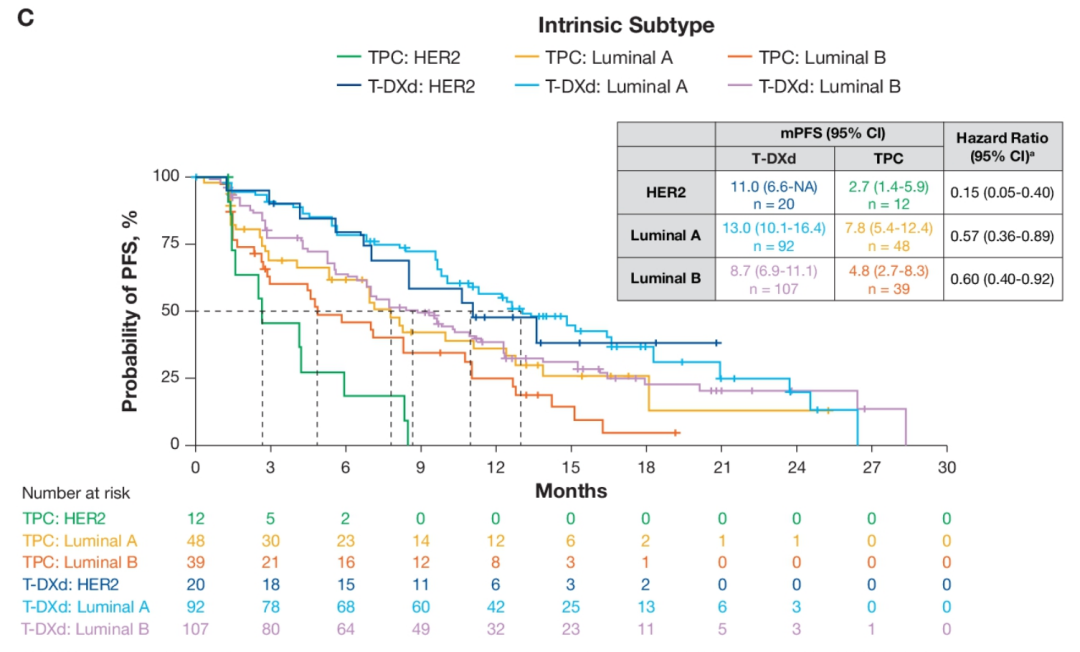 PIK3CA突变型(HR 0.50)、野生型(HR 0.60)患者均可从T-DXd治疗中相比TPC(研究者选择的治疗)增加获益;而且T-DXd治疗这两种PIK3CA状态患者的无进展生存期(PFS)相似(10.0 vs 9.7个月)。