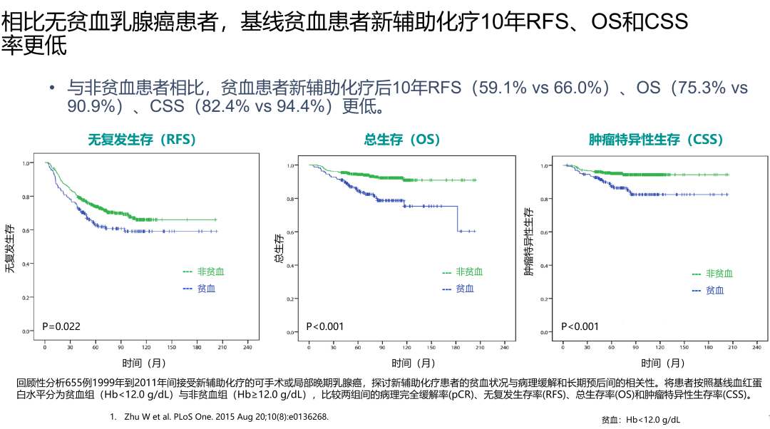 CIA不仅会降低乳腺癌患者生存质量,也会缩短生存时间。一项乳腺癌新辅助化疗的回顾性研究显示,与非贫血组相比,贫血组[血红蛋白水平(Hb)<12.0g/dL]新辅助化疗后的10年的无复发生存率(RFS)更低,为59.1%vs 66.0%;10年总生存率也更低,为75.3%vs 90.9%;排除混杂因素后的10年肿瘤特异性生存率(CSS)也更低,为82.4%vs 94.4%,均存在显著性差异[7]