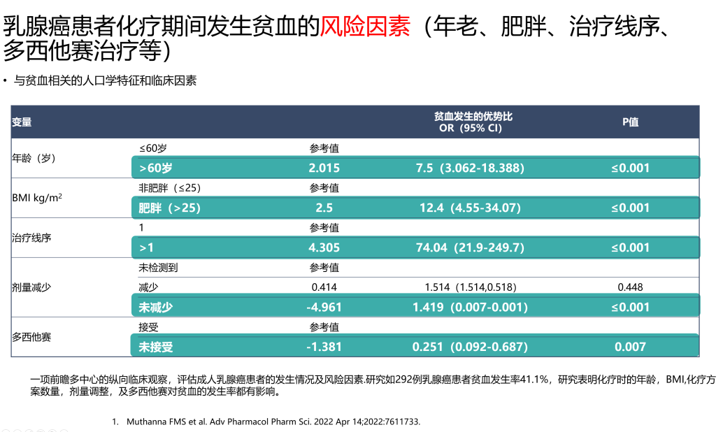 贫血还会降低患者的生活质量,在对146例接受了AC或AC-T方案化疗的乳腺癌患者进行生活质量评分发现,≤1度贫血患者可较2度及以上贫血患者改善EORTC QLQ-30量表评分14.541分;2度及以上贫血往往会导致患者更严重的疲劳[10]。年龄大于60岁、肥胖、治疗线序、方案足剂量使用、治疗方案含多西他赛都是乳腺癌患者化疗期间易发生贫血的风险因素[11]