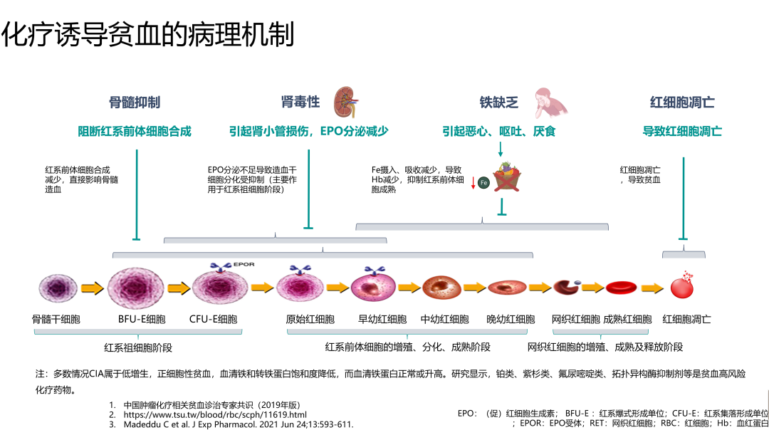 在正常人体内,红细胞的生成需要经过三个阶段,分别是红系祖细胞阶段;红系前体细胞的增殖、分化、成熟阶段;网织红细胞的增殖、成熟及释放阶段。化疗可以通过影响红细胞生成的不同阶段导致患者发生贫血:比如化疗的骨髓抑制作用可以阻断红系前体细胞的合成,直接影响骨髓造血;化疗导致的肾毒性会引起肾小管损伤致使促红细胞生成素(EPO)分泌减少,从而抑制红系祖细胞分化;化疗引起的恶心、呕吐、厌食等会造成铁摄入减少,影响血红蛋白的生成,进而抑制红系前体细胞的成熟;化疗药物还会直接造成红细胞凋亡,进而导致贫血的发生[12,13,14]