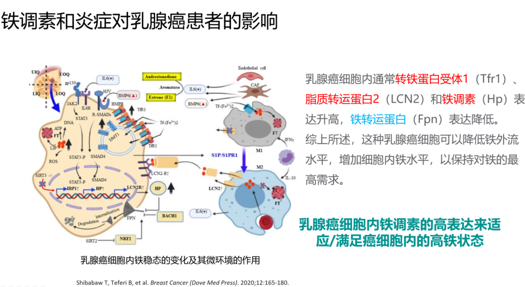 此外,乳腺癌本身可能也与患者发生贫血相关。基础研究显示:一方面,乳腺癌细胞内转铁蛋白受体1(Tfr1)、脂质转运蛋白2(LCN2)、铁调素(Hp)表达升高,铁转运蛋白(Fpn)表达降低,从而会降低癌细胞铁外流、维持癌细胞内高铁状态[15]