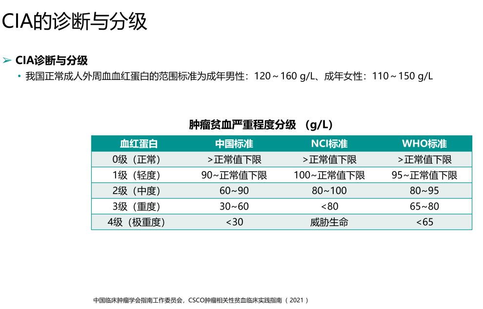 在CIA的分级管理中,国内外学者对CIA的分级并不完全一致,我国在此方面的分级更为严格。根据《中国临床肿瘤学会(CSCO)肿瘤相关性贫血临床实践指南(2021)》(《CSCO CIA指南》),我国正常成人外周血血红蛋白的范围标准为,成年男性:120~160 g/L、成年女性:110~150 g/L。高于正常值下限即为0级贫血;90 g/L~正常值下限为1级贫血,属于轻度贫血;60g/L~90g/L为2级贫血,属于中度贫血;30 g/L~60g/L为3级贫血,属于重度贫血;<30g/L为4级贫血,属于极重度贫血。临床应根据贫血的严重性对患者进行分层管理[17]