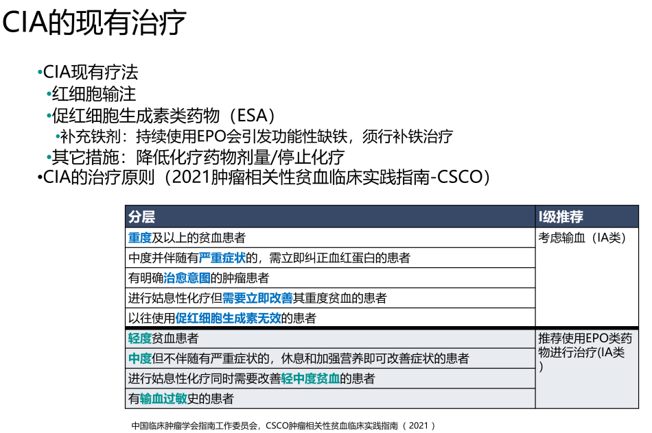 目前CIA的主要疗法包括红细胞输注、使用促红细胞生成素类药物(ESA)、补充铁剂、对化疗减量或停药。《CSCO CIA指南》建议对重度及以上患者、中度伴严重症状且需立即纠正血红蛋白的患者、有明确治愈意图的患者、进行姑息化疗但需要立即改善重度贫血的患者、既往使用促红细胞生成素无效的患者推荐输血治疗(IA类);对于轻度贫血患者、中度但不伴随严重症状、进行姑息化疗同时需改善轻中度贫血患者、有输血史患者IA类推荐使用EPO类药物(IA类)[17]