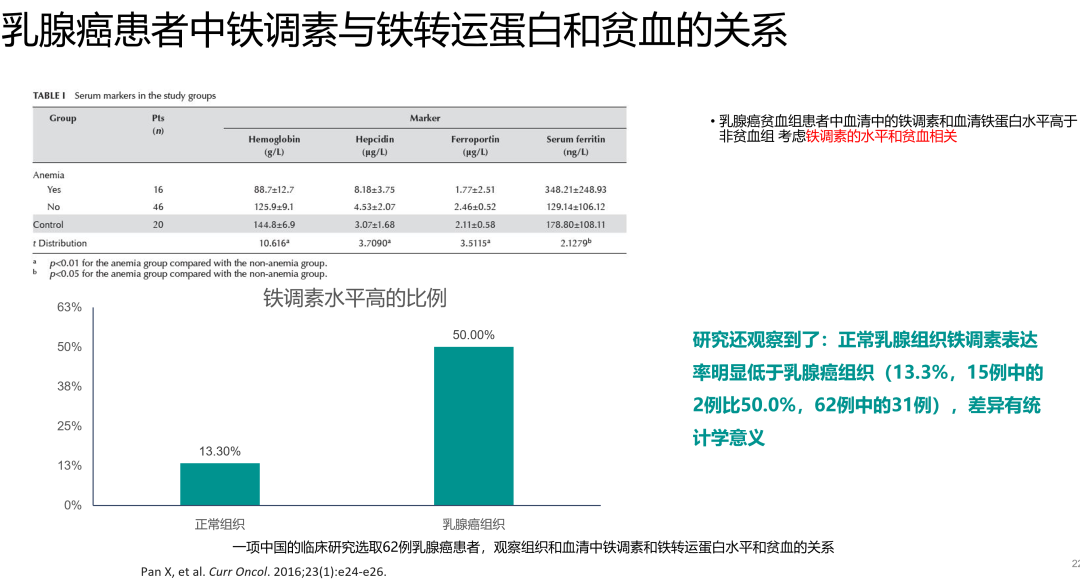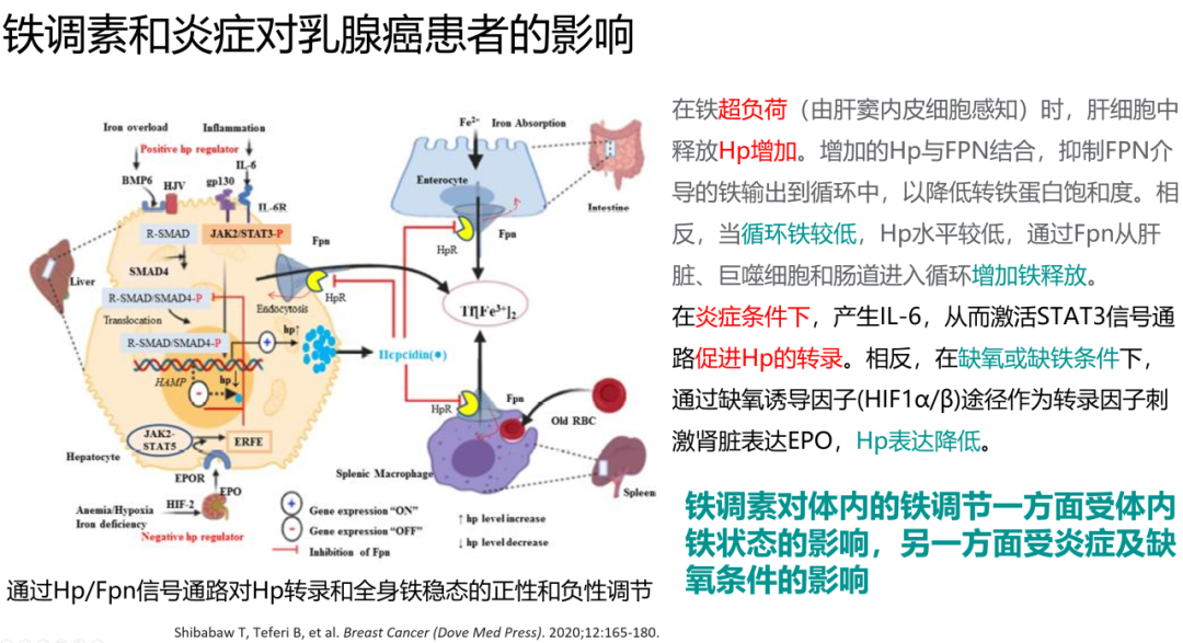 临床研究也观察到了这一点,乳腺癌贫血组患者血清中的铁调素(8.18 vs 3.07 ug/L)和血清铁蛋白水平(348.21 vs 178.80 mg/L)高于非贫血组,乳腺癌组织铁调素水平显著高于正常乳腺癌组织。再次佐证了乳腺癌患者贫血与铁调素、转铁蛋白的相关性[16]