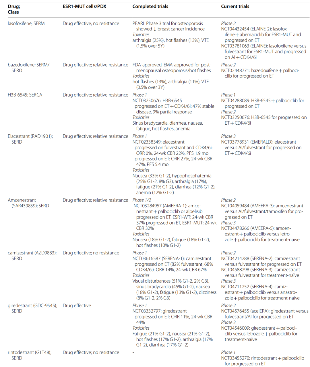 SERMs和选择性雌激素受体共价拮抗剂(SERCAs)是治疗MBC合并ESR1-MUT的有前景的药物。虽然在临床前模型中ESR1-MUT对于他莫昔芬存在相对耐药,但ESR1-MUT在既往接受过他莫昔芬单药治疗的MBC患者,甚至在他莫昔芬耐药的MBC患者中并未表现出富集[21,6,7,17,30]。这提示了一个尚未得到验证的假设,即与临床前研究不同,ESR1-MUT在临床环境中不会引起他莫昔芬耐药。