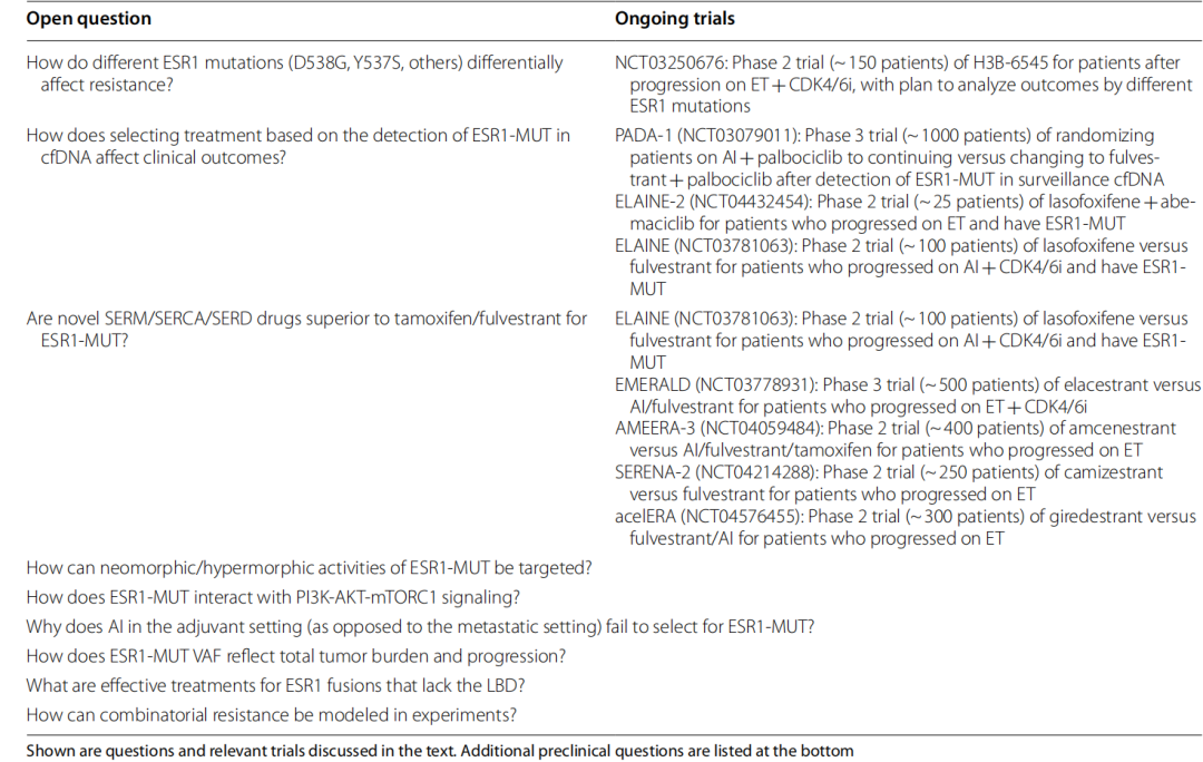 与这些同等重要的是专注于开发新型治疗药物的研究。下一代口服SERM、SERCAs和SERD是HR阳性乳腺癌患者有希望的治疗方法。了解ESR1-MUT患者接受这些治疗的情况将非常重要,因为我们希望这些治疗将被证明优于他莫昔芬和氟维司群。另外一个步骤将是按照PADA-1的测试这些新药,研究cfDNA检测在治疗选择中的效用。最后,除了直接靶向ESR1-MUT细胞中的ER组成型活性外,ESR1-MUT肿瘤在改变的靶基因、蛋白相互作用和下游细胞适应中可能还有其他弱点。我们需要进一步研究来了解ESR1-MUT如何增加对Cyclin D-CDK4/6的依赖,因为初步的PADA-1数据表明,在一些患者中,AI+哌柏西利可清除ESR1-MUT[4]。对接受各种治疗的MBC患者的cfDNA进行的单独研究表明,与未接受治疗的患者(36%)相比,接受哌柏西利治疗的患者(9%)的ESR1-MUT患病率降低。这种效应在体外并没有清楚地看到,因此也提出了ESR1-MUT如何影响肿瘤环境中的癌细胞脆弱性的问题。