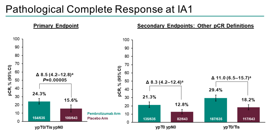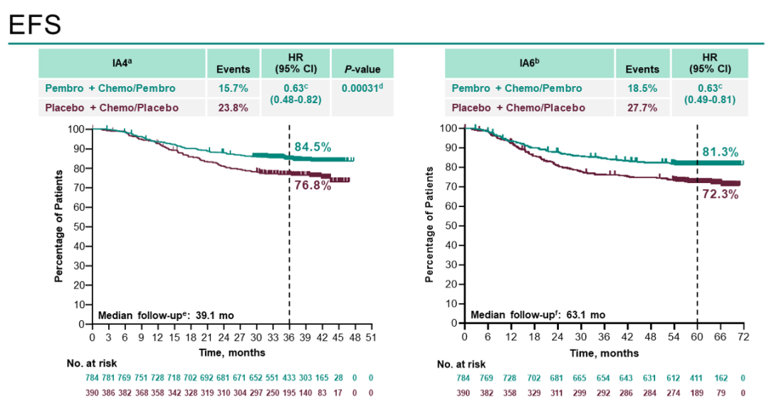 截至2023年3月23日,中位随访63.1个月,再一次确证了新辅助帕博利珠单抗联合化疗的持续获益,与对照组相比60个月EFS提高了9%(81.3%vs 72.3%)。无论pCR结果如何,新辅助帕博利珠单抗+化疗并在术后序贯帕利珠单抗治疗辅助治疗,相比于新辅助单纯化疗,可持续为Ⅱ-Ⅲ期三阴性乳腺癌患者带来EFS获益。