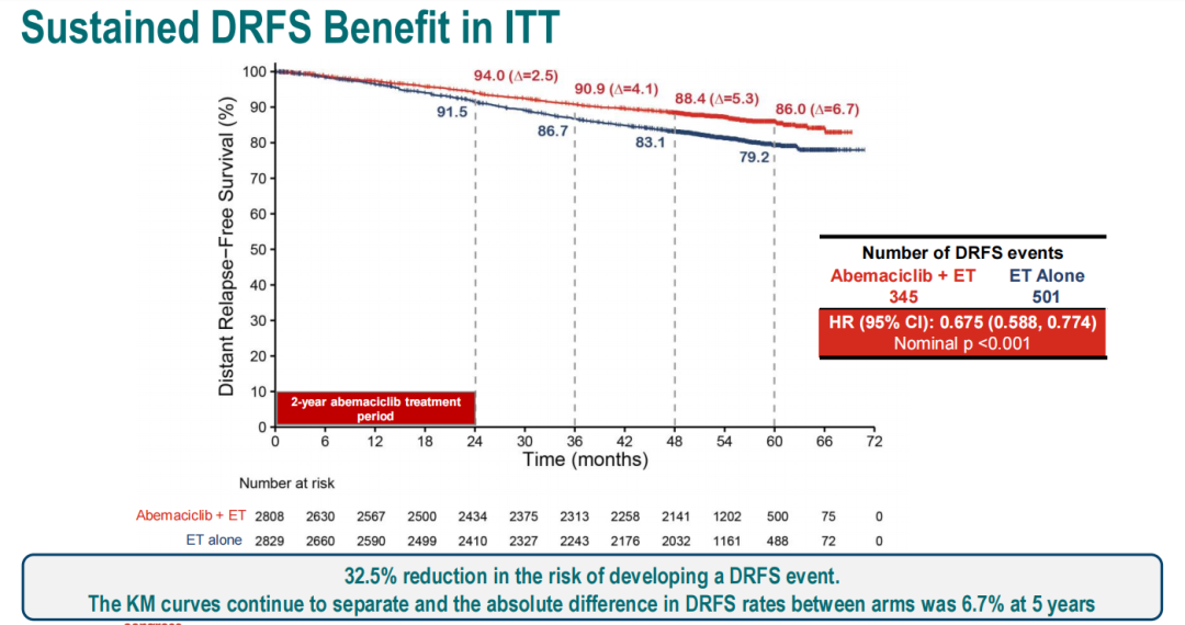 阿贝西利组的5年DRFS率相较于对照组提高6.7%,DRFS事件发生的风险降低32.5%(86.0%vs 79.2%,HR 0.675,95%CI:0.588~0.774)。