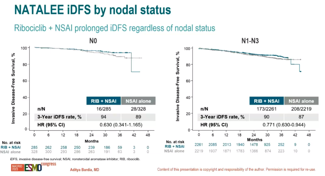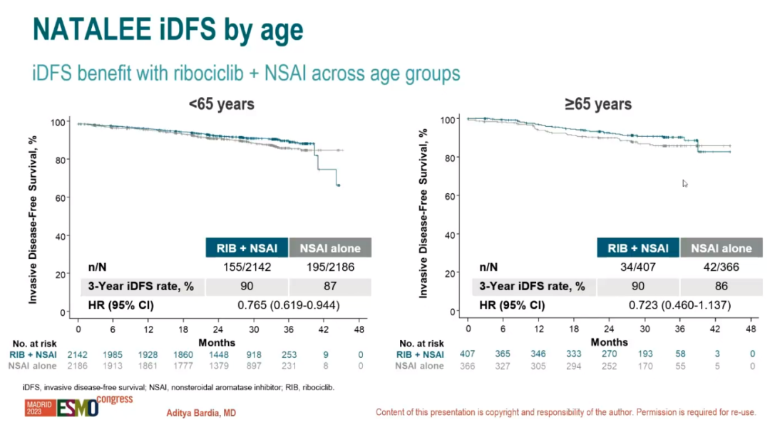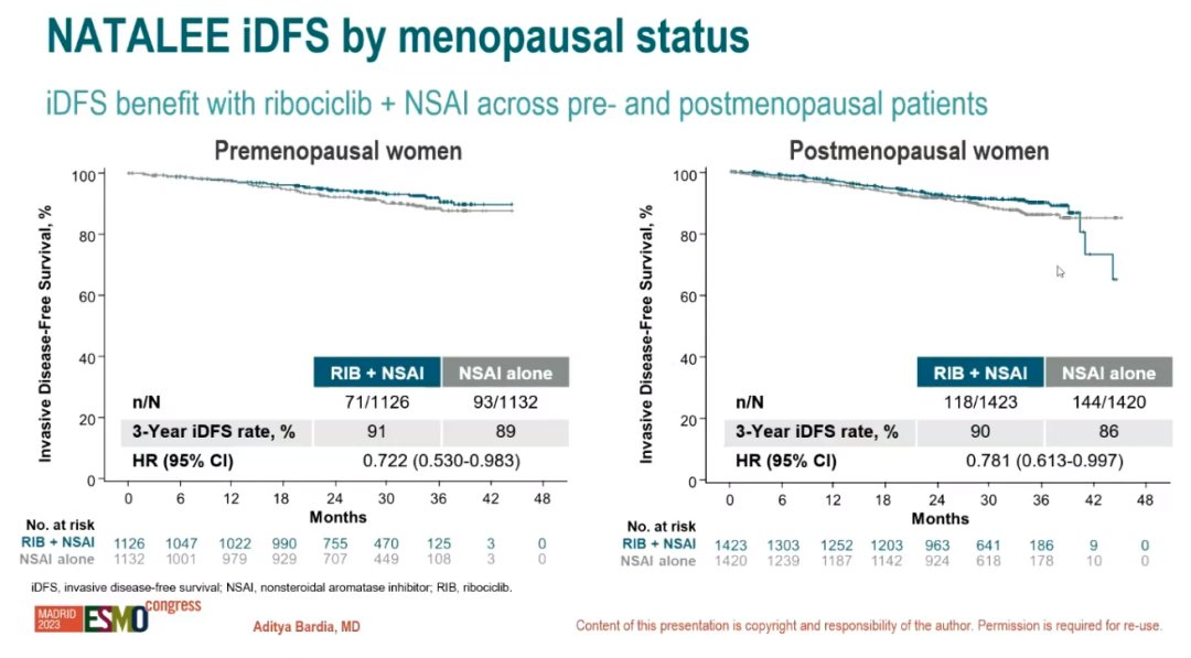 本次ESMO大会上,NATALEE研究入组患者iDFS的预设探索性亚组分析结果公布,截至2023年1月11日,该分析共纳入5101例患者,两组患者iDFS的中位随访时间均为27.7个月,总体而言,在所有临床相关亚组中,瑞波西利联合内分泌治疗对比单药内分泌治疗的iDFS获益是一致的,这与整体人群中观察到的结果一致。