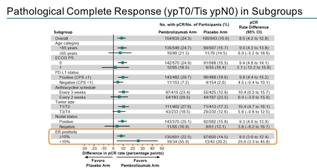 此外,在本届ESMO大会上,我们也关注到,免疫治疗在早期乳腺癌患者中的大胆尝试。KEYNOTE-756研究旨在比较帕博利珠单抗/安慰剂+化疗新辅助治疗,序贯帕博利珠单抗/安慰剂+ET辅助治疗高危、ER+/HER2-早期乳腺癌。研究结果显示,帕博利珠单抗联合化疗组vs安慰剂联合化疗组的病理完全缓解(pCR)率为24.3%vs 15.6%,治疗差异8.5%,95%CI:4.2~12.8;P=0.00005。在预先指定的亚组中,pCR获益总体上是一致的,包括肿瘤PD-L1状态(CPS≥1 vs<1)、淋巴结受累(阳性vs阴性)和雌激素受体(ER)阳性(≥10%vs<10%)。