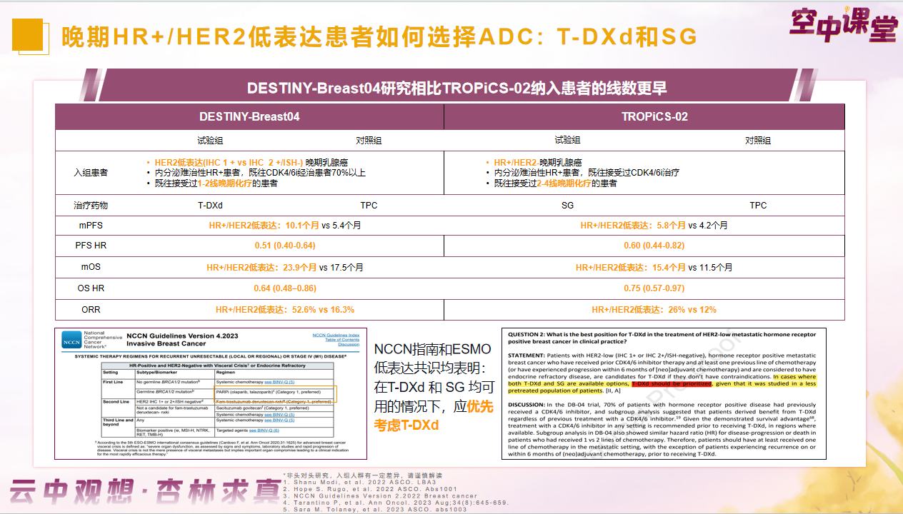 当前,T-DXd和SG在HR+晚期乳腺癌患者治疗中均有不同程度的PFS和OS获益,但二者相关研究在入组人群上存在差异,其中,DESTINY-Breast04研究相比TROPiCS-02研究纳入的患者治疗线数更早。基于T-DXd和SG在HR+晚期乳腺癌患者治疗中的表现,国际各大指南、共识等都进行了相关推荐。NCCN指南[19]和《ESMO关于HER2低表达乳腺癌的专家共识(ESC)》[32]指出,对于HR+/HER2低表达转移性乳腺癌患者,在T-DXd和SG均可用的情况下,应优先考虑T-DXd。对于ER+/HER2-晚期乳腺癌患者,《ESMO转移性乳腺癌指南》[21]也推荐T-DXd作为HER2低表达患者一线CDK4/6i快速进展或两线内分泌治疗进展后的优选方案;而HER2 IHC 0的患者选择SG治疗。