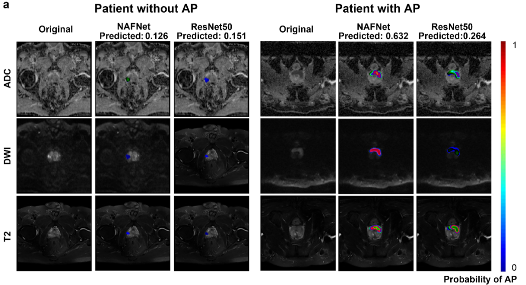 图1:利用新型深度学习网络NAFNet在术前患者MRI影像上判断患者术后不良病理事件发生概率。