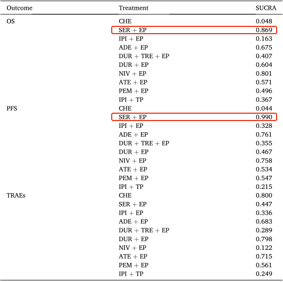 吉林大学中日联谊医院一项纳入6项III期研究:IMpower133、CASPIAN、CAPSTONE-1、KEYNOTE604、ASTRUM-005、CA184-156;3项II期研究:EA5161、NCT00527735、REACTION 2020;共计4037例患者的Meta分析也展示了类似的结果[6]。该研究采用固定效应模型评估疗效和安全性,采用累积排序概率图下面积(SUCRA)对治疗策略进行排序,SUCRA评分越高疗效越好。结果显示:OS方面,与化疗和伊匹木单抗联合化疗相比,斯鲁利单抗联合卡铂-依托泊苷显著提高了生存率(HR=0.63;95%CI=0.49–0.82);PFS方面,斯鲁利单抗联合卡铂-依托泊苷在所有治疗中使患者获益最大(HR=0.48;95%CI=0.39–0.6);安全性方面各组间无显著差异。