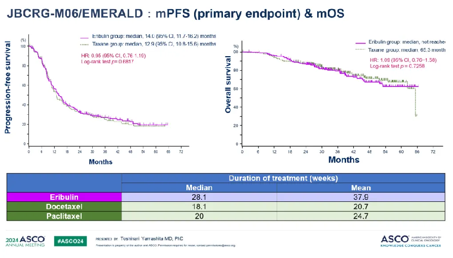 EMERALD该研究是一项日本发起的多中心、随机、非劣效性、Ⅲ期临床研究[1]。纳入既往未经化疗的局部晚期或转移性HER2+乳腺癌患者446例,患者中位年龄56.0岁,25.3%的患者未绝经,57.6%为ER+,59.0%为Ⅳ期,31%于围术期接受过紫杉类治疗。按1:1分组分别予以曲妥珠单抗和帕妥珠单抗(HP双靶)联合艾立布林方案,以及标准的HP双靶联合紫杉类进行一线治疗,其中艾立布林+HP组中位治疗时间(DOT)为28.1周,较紫杉类(多西他赛18.1周,紫杉醇20周)+HP组持续超出约10周。