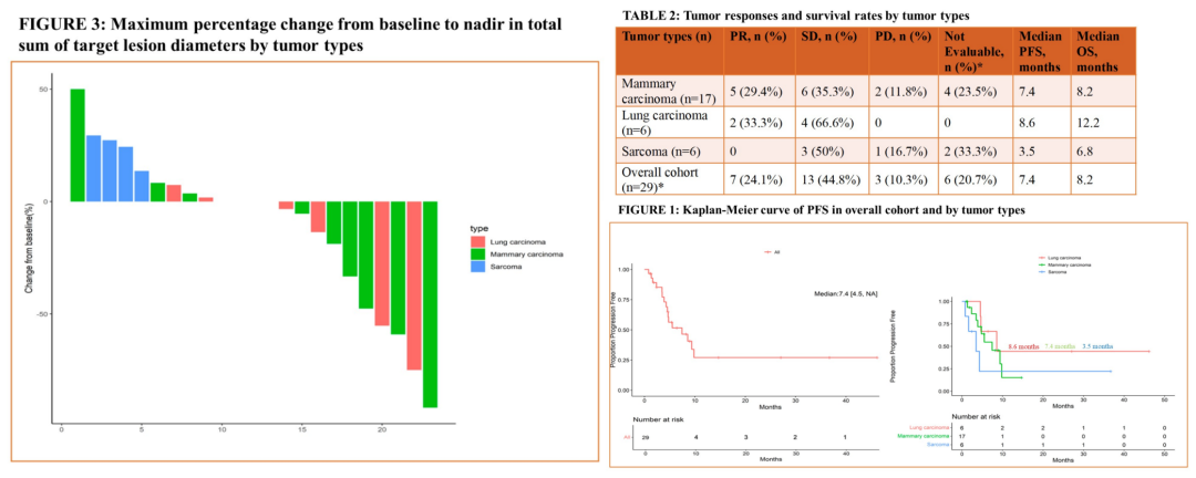 艾立布林的上述药物优势,不仅体现在晚期乳腺癌领域,在众多其他实体瘤领域也展现了巨大的应用潜力。本次ASCO大会报道了多项临床试验显示了艾立布林联合治疗的积极抗肿瘤活性。一项美国多中心Ⅱ期研究[8],纳入了29例至少接受过≥3线化疗的实体瘤,包括IV期乳腺癌、肺癌和肉瘤患者,给予艾立布林联合小分子酪氨酸激酶抑制剂(TKI)仑伐替尼治疗,可获得25%的ORR和7.4个月的中位PFS;且联合治疗的安全性可控,≥3级的不良事件发生率为34.5%,以中性粒细胞减少(17.2%)和高血压(13.8%)常见,AE相关停药率仅为6.8%。