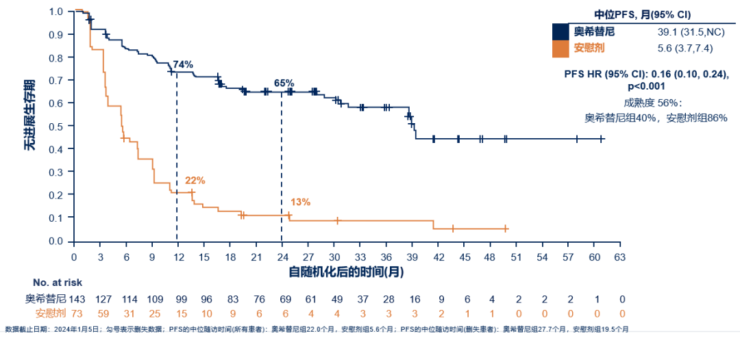 III期LAURA试验(NCT03521154)纳入CRT治疗期间或治疗后无进展的局部晚期、不可切除的III期EGFRm NSCLC患者,以2:1的比例随机分配至奥希替尼组或安慰剂组。2024 ASCO全体会议上发表的结果显示,该研究已达到PFS主要终点,奥希替尼组和安慰剂组经BICR评估的中位PFS分别为39.1个月vs 5.6个月(P<0.001),HR为0.16。相较于安慰剂组,奥希替尼组的客观缓解率(ORR)获得明显提升(57%vs 33%),中位缓解持续时间(DoR)也获得大幅改善(36.9个月vs 6.5个月)