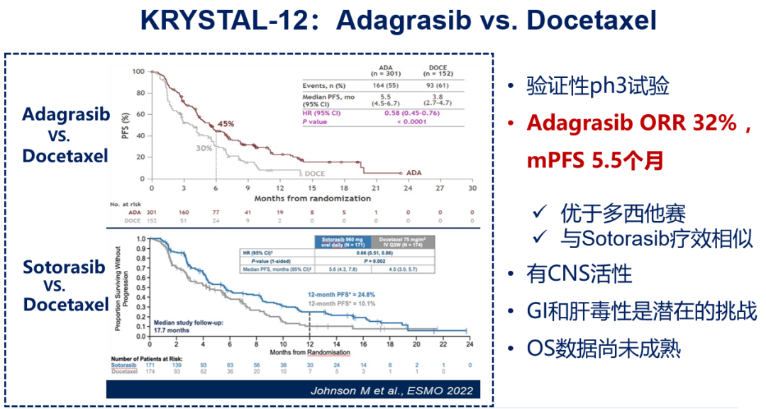 根据2024 ASCO发布的III期KRYSTAL-12试验(NCT04685135)的主要分析,在既往接受过铂类化疗与抗PD-(L)1治疗(同时或序贯)的KRASG12C突变局部晚期或转移性NSCLC患者中,Adagrasib相比多西他赛使PFS有统计学差异显著和有临床意义的改善(中位PFS:5.5和3.8个月;HR=0.58;P<0.0001);ORR也显著更高(32%vs 9%);颅内缓解率增加了1倍以上(24%vs 11%)。OS数据尚未成熟。胃肠道(GI)毒性和肝毒性是这种靶向治疗面临的潜在挑战。